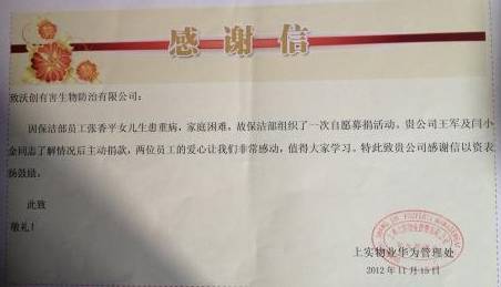 上實物業(yè)公司致沃創(chuàng)公司的感謝信